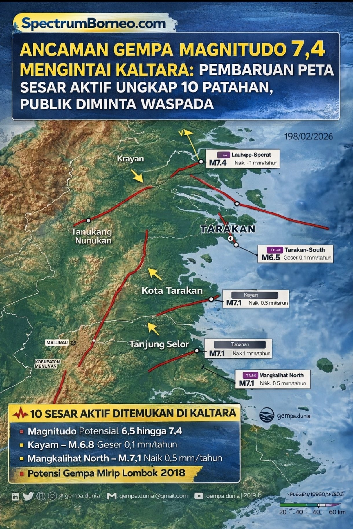 Jika sebelumnya hanya teridentifikasi tiga sesar aktif, kini tercatat menjadi sepuluh sesar aktif, dengan sejumlah patahan berada di wilayah Kota Tarakan, Kabupaten Bulungan, Malinau, Nunukan hingga kawasan Krayan. Beberapa di antaranya disebut berpotensi memicu gempa dengan kekuatan hingga magnitudo 7,4.