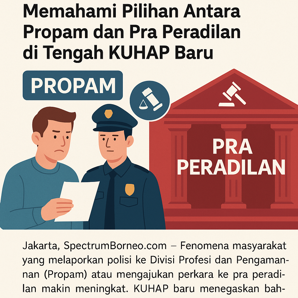 Jakarta, SpectrumBorneo.com – Fenomena meningkatnya laporan masyarakat terhadap aparat kepolisian melalui Divisi Profesi dan Pengamanan (Propam) serta pengajuan pra peradilan menjadi perhatian serius dalam evaluasi sistem penegakan hukum nasional. Perubahan dalam KUHAP Baru memperjelas batasan dan tujuan kedua mekanisme tersebut, sekaligus menjawab keluhan publik terkait laporan yang tidak ditindaklanjuti.
