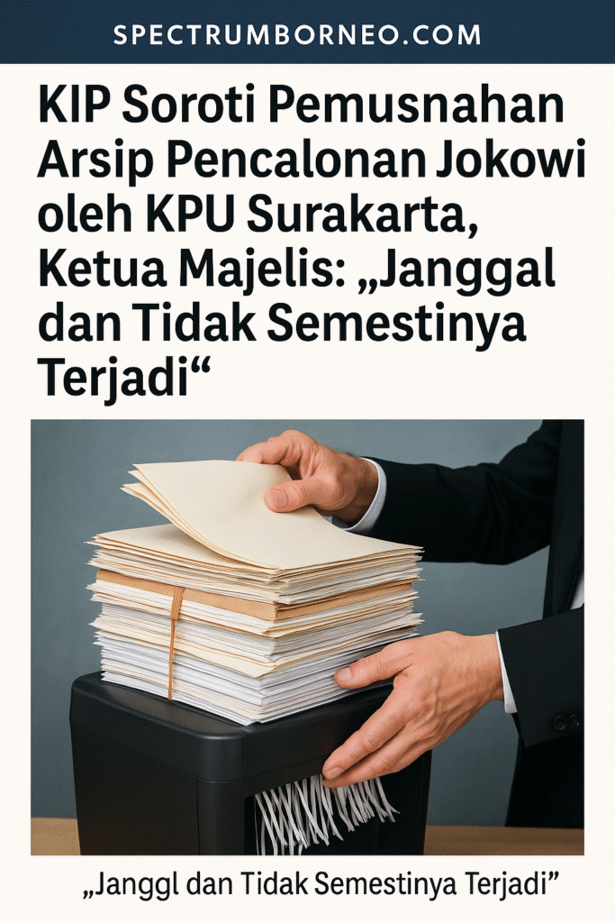 SpectrumBorneo.com – Ketua majelis sidang Komisi Informasi Pusat (KIP) menyoroti langkah Komisi Pemilihan Umum (KPU) Surakarta yang memusnahkan salinan arsip pencalonan Joko Widodo saat maju sebagai Wali Kota Surakarta. Sorotan itu muncul dalam sidang sengketa informasi terkait ijazah di Jakarta, pada Minggu (17/11).