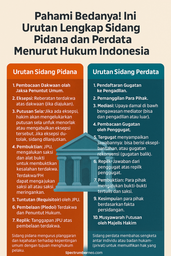 SpectrumBorneo.com – Banyak masyarakat masih belum memahami perbedaan antara sidang pidana dan sidang perdata, padahal keduanya mengatur hal yang sangat berbeda dalam sistem peradilan Indonesia. Untuk meningkatkan literasi hukum publik, berikut kami sajikan penjelasan lengkap mengenai urutan proses persidangan pada dua jenis perkara tersebut.