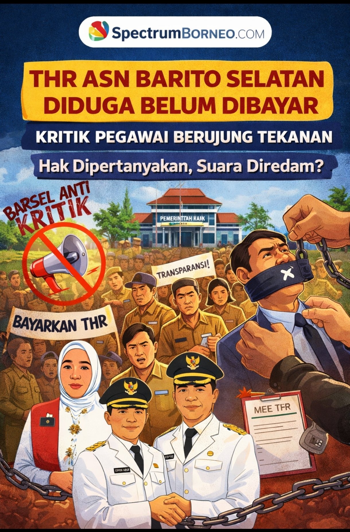 BARITO SELATAN, KALTENG, SpectrumBorneo.com — Dugaan keterlambatan bahkan belum cairnya Tunjangan Hari Raya (THR) bagi Aparatur Sipil Negara (ASN), tenaga honorer, hingga CPNS di Kabupaten Barito Selatan kini berkembang menjadi isu serius yang melampaui persoalan administratif. Keluhan yang awalnya muncul di ruang publik—khususnya media sosial—justru disebut berujung pada pemanggilan internal hingga ancaman mutasi dan pemberhentian bagi pegawai yang dinilai “terlalu vokal”.
